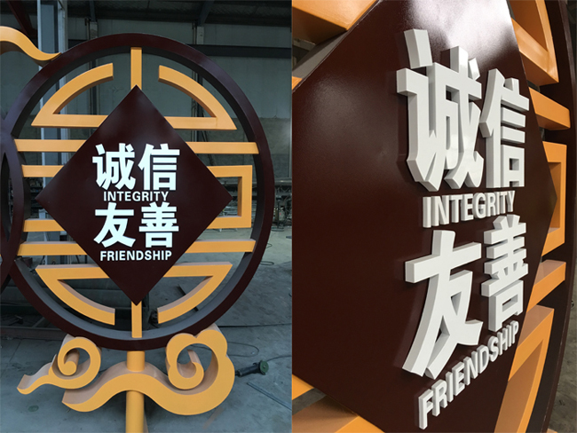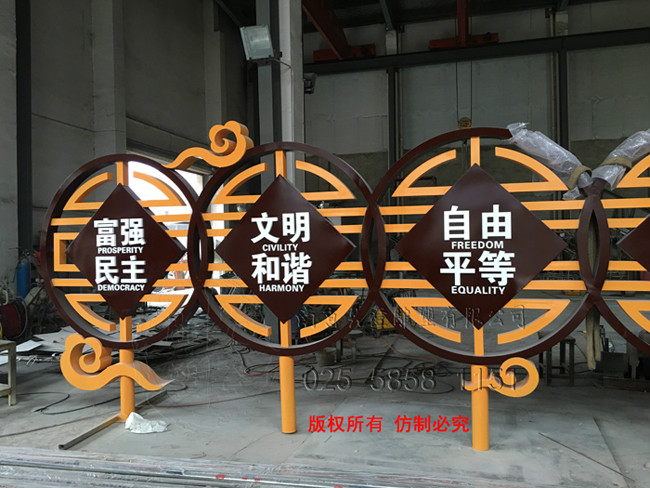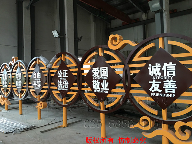 核心價值觀雕塑,位于南京市江寧區谷里街道徐家院,采用不銹鋼材質噴漆技術